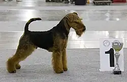 The Welsh Terrier is coloured tan on the head, legs and underbelly with a black or sometimes grizzle saddle. Females are sometimes a simple darker tan all over. The breed is a sturdy and compact dog of about medium size that can grow up to 15.5 in (39 cm)[3] with a weight of 20–22 pounds (9.1–10.0 kg). The tail was usually docked until this was prohibited in the United Kingdom in 2006, being preferred in order to complete the image of a square dog, as tall as it is long. The body shape is rectangular, with an elongated, "brick-like" face. This shape is formed by the whiskers and beard.[4] With pedigrees the face can take a more oval shape and be finer boned and more distinct. The hair contains two layers, an undercoat that insulates and abrasive fur on top that protects against dirt, rain, and wind.[5] Welsh Terriers are born mostly all black and during the first year they change colour to standard black and tan grizzle.
