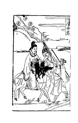 Wenchang Wang (Chinese: 文昌王; pinyin: Wénchāng Wáng; Pe̍h-ōe-jī: Bûn-chhiong Ông), also known as Wenchang Dijun (Chinese: 文昌帝君; pinyin: Wénchāng Dìjūn; Pe̍h-ōe-jī: Bûn-chhiong Tè-kun), is a Taoist deity in Chinese mythology, known as the God of Culture and Literature.[1] He is also at times referred to simply as Wen Qu, or Wen. The literal translation of his name would be King (王) of Flourishing (昌) Culture/Language (文). Wenchang Wang is physically represented by a constellation of six stars near the Big Dipper. The stars all had names of their own: Shangjiang (上將), Cijiang (次將), Guixiang (貴相o), Siming (司命), Sizhong (司中), and Silu (司祿). Wenchang Wang is often depicted as an elderly scholar accompanied by two attendants, Tianlong (天聾 or Heaven-Deaf) and Diya (地啞 or Earth-Mute).[2] He sometimes holds a pen and a book that says "Heaven determines literary achievement".[3] He has historically been called upon by scholars and writers who need inspiration or help right before an exam.