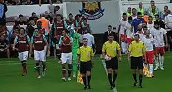 The draw for the third qualifying round was made on 15 July 2016, with West Ham being drawn against Domžale of Slovenia, after they defeated Shakhtyor Soligorsk from Belarus in the second qualifying round.[94] West Ham were originally drawn to play the first leg at their new home, the London Stadium, but due to a clash with the Anniversary Games, the club received permission from UEFA to reverse the order of the legs.[95] The away leg was switched from Domžale's Sports Park ground, to the 16,038 capacity Stožice Stadium in Ljubljana, home of the Slovenia national team.[96] West Ham lost the first leg away in Slovenia on 28 July, with Matic Črnic scoring a penalty in the 11th minute after a handball by debutant Håvard Nordtveit, only for Mark Noble to equalize from the penalty-spot seven minutes later, after Winston Reid was fouled by Domžale's goalkeeper Axel Maraval. Črnic scored a second goal three minutes into the second half to give the Slovenians a 2–1 victory.[97] Seven days later, West Ham hosted Domžale in the club's first ever game in their new home, the London Stadium. West Ham won 3–0 with two goals from Cheikhou Kouyaté and a third from Sofiane Feghouli, resulting in a 4–2 aggregate victory to progress to the play-off round.[98]