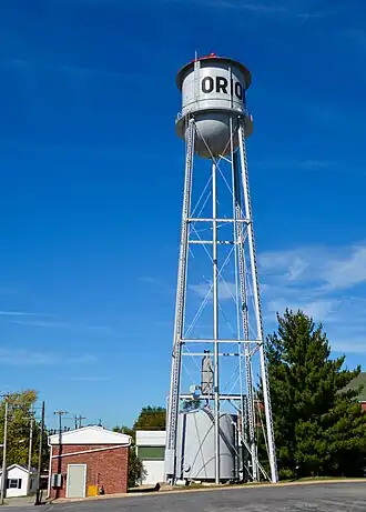 The West Water Tower and Ground Storage Tank are a historic water tower and storage tank located at 310 11th Avenue in Orion, Illinois. The tower and tank were built in 1928 as part of the village's new water system, which had been approved the previous year. The water system was introduced both as a response to several fires which had plagued the village and as an effort to bring modern technology and progress, among other civic concerns. The water tower consists of a steel tank with a hemispherical bottom supported by a steel trestle; the structure is 136.5 feet (41.6 m) tall. The ground storage tank, located at the base of the tower, is made of redwood and holds 30,000 US gallons (110,000 L; 25,000 imp gal) of water.[2]