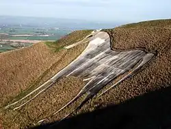 Westbury White Horse or Bratton White Horse is a hill figure on the escarpment of Salisbury Plain, approximately 1.5 mi (2.4 km) east of Westbury in Wiltshire, England. Located on the edge of Bratton Downs and lying just below an Iron Age hill fort, it is the oldest of eight extant white horses carved in Wiltshire.[1] It was restored in 1778, an action which may have obliterated another horse that had occupied the same slope. A contemporary engraving from around 1772 appears to show a horse facing in the opposite direction that was rather smaller than the present figure. There is, however, no documentation or other evidence for the existence of a chalk horse at Westbury before 1772.