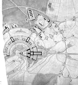 The main road of an SS village was also to be centred on the North Tower of the castle with a diameter of 1270 m. This road was to be connected with three radial roads and gates with the castle area. The residential area was to be placed in the northwest, the centre of the village in the north, and the SS-barracks in the west of the castle area; between the barracks and village a villa colony for higher SS-leaders; in the southwest farmsteads.
