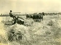 After the American Civil War, the western Mississippi Valley and the Great Plains to its west, where large fertile lands were available, resulted in expanding wheat farming. By this time, better tillage equipment was in use, railroads provided better access to world markets, better trading and warehousing facilities were facilitated, and more particularly introduction of hard winter was introduced.[9] In the 1870s, Turkey red wheat, a hard variety of wheat, was introduced to the farmlands of Kansas by Russian Mennonite immigrants. This wheat variety spread quickly.[10] New technology substantially enhanced productivity in the 19th century, as sowing with drills replaced broadcasting, cradles took the place of sickles, and the cradles in turn were replaced by reapers and binders. Steam-powered threshing machines superseded flails. By 1895, in Bonanza farms in the Dakotas, it took six different people and 36 horses pulling huge harvesters, working 10 hours a day, to produce 20,000 bushels. Following the invention of the steel roller mill in 1878, hard varieties of wheat such as Turkey Red became more popular than soft, which had been previously preferred because they were easier for grist mills to grind.[11]