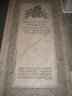 Prince William died in Predeal, near Sinaia, in Romania, leaving his son, Hereditary Prince Carol Victor, as heir to his Albanian claims.[9] He was buried at the Lutheran Church in Bucharest.
