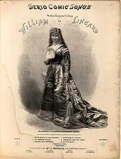 Lingard often appeared on stage in drag, in the high fashion style of the era.[12] Additionally, he mastered the art of quick change, eventually becoming able to act the part of some sixteen characters, with only a few seconds for each costume change. Many were impersonations of well-known historical characters, such as Otto von Bismarck, Napoleon III, and Brigham Young.[13]