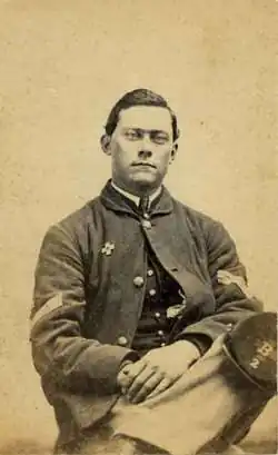 Planted the flag upon the parapet while the enemy still occupied the line; was the first of his regiment to enter the works.[1]