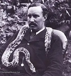 ![]() Clarke in 1900 with a pet python | |