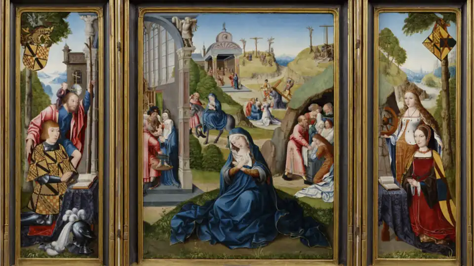 Christopher Knyvett.[14] Christopher Knyvett, the third brother in his family, is particularly noteworthy because he and his wife from Brabant are believed to be depicted in the 'Ashwellthorpe Triptych' housed at Norwich Castle Museum.[53] Christopher likely followed his elder siblings to the court of Henry VIII at the beginning of the new reign, establishing his presence there by October 1512 when he was dispatched as an envoy to the court of Margaret, Duchess of Savoy, the regent of the Netherlands. Margaret’s court was renowned for its culture, nobility, and learning, attracting English ladies such as Anne Boleyn for their courtly education. Although it’s tempting to connect Christopher’s marriage to the 'daughter and heir of the lord of Ashe near Brussels' and the painting to this diplomatic mission, he was probably quite young at that time. It's more plausible that the marriage occurred due to a later mission, as the painting is dated '1519'. While there is no direct evidence of Christopher being in the Netherlands after 1512, it seems highly probable, especially since his brother Anthony was sent there on a mission in 1518. If Anne Ashe was indeed an heiress, as genealogical records suggest, this marriage was an exceptionally advantageous match for a younger son without clear prospects of acquiring land. It is indeed true that he appeared to enjoy favor at Court, and from 1515, he received an annual wage of £20 for his role in the Household. It's likely that he joined the King during the siege of Tournai in 1513, and in 1515, he and his brothers, James and Anthony, were granted the lands and possessions of two 'rebels' in that city. However, whether they benefited financially from this grant remains uncertain. There is no additional evidence of any other grants or promotions in the King's service. Nonetheless, his prospects improved significantly at the end of 1519 when he inherited the reversion of a modest yet substantial estate in Northamptonshire from his cousin, John Colet, Dean of St. Pauls. On 14 November of that year, he was granted control of the estate, subject to a rent of 20 marks per year payable to Colet's mother, Christian Colet, who was Christopher's great-aunt. It's possible that Christopher's marriage and the commissioning of the Triptych were linked to his newfound status as a small landowner, although there is no evidence to support this. No further mentions of Christopher have been found following the payment of his half-year's wages in early 1520, and it is likely that he passed away later that year or shortly thereafter. If he had moved to live on his wife's estates in Brabant, it would be difficult to explain how the Triptych ended up at his brother Edmund's residence in Ashwellthorpe. There is no evidence that he had any children, and his wife's fate remains unknown.[54][55]The Ashwellthorpe Triptych. The figures on the far right and the far left shown kneeling and praying are believed to be Christopher Knyvett and his wife Anne Ashe. Christoper is wearing the arms of Knyvett, Argent, a bend within a bordure engrailed all sable, quartered with those of Clinton, chequy or and gules, a bend ermine.[40] Above the lady is Knyvett impaling the lady's coat of arms, Or a fess sable Saltire gules