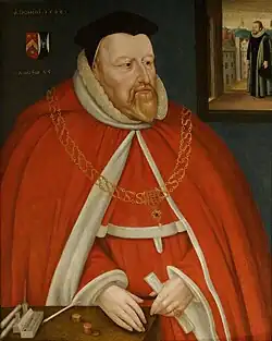 He died on 9 October 1604, in the year of his seventieth birthday, at his house at Little Fulford (renamed Shobroke Park in the early 1800s, demolished)[15] east of Crediton in Devon. His monument exists in Crediton parish church to the north of the chancel, showing a life-like effigy of his recumbent figure his head propped up on his hand. He had served at the Exchequer for eleven years and nine months, and his funeral and burial in Crediton Church appears to have been a significant event, as it was well attended, according to Prince not only by "The gentry, clergy, and others in these parts, but also with heralds at arms, marshalling all according to their rank and place".[3]