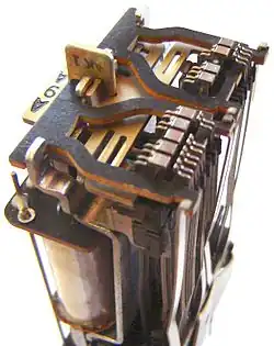 A wire spring relay is a type of relay, that has springs made from drawn wires of nickel silver, rather than cut from flat sheet metal as in the flat-spring relay. This class of relays provided manufacturing and operating advantages over previous designs. Wire spring relays entered mass production in the early 1950s. [1] [2]