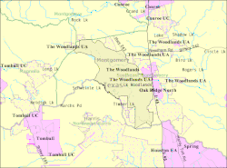 104. ^ "2020 CENSUS - SCHOOL DISTRICT REFERENCE MAP: Montgomery County, TX" (PDF). U.S. Census Bureau. Retrieved April 27, 2022. - Compare to The Woodlands boundary map
