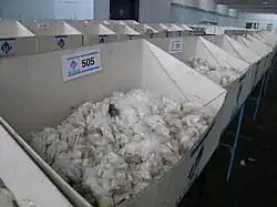 In December 2004, a bale of the then world's finest wool, averaging 11.8 microns, sold for AU$3,000 per kilogram at auction in Melbourne. This fleece wool tested with an average yield of 74.5%, 68 mm (2.7 in) long, and had 40 newtons per kilotex strength. The result was A$279,000 for the bale.[29] The finest bale of wool ever auctioned was sold for a seasonal record of AU$2690 per kilo during June 2008. This bale was produced by the Hillcreston Pinehill Partnership and measured 11.6 microns, 72.1% yield, and had a 43 newtons per kilotex strength measurement. The bale realized $247,480 and was exported to India.[30]