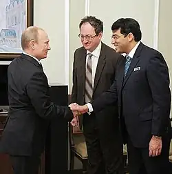 Russian President Vladimir Putin meets Anand and Gelfand after the competition.