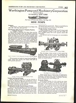 The United States Navy used Worthington pumps to pump boiler feed water, bilge water, and water for fire fighting and general services aboard various ships during the American Civil War, including the USS Monitor.[3] After Henry Worthington died in 1880 he was succeeded by his son Charles Campbell Worthington (1854–1944). While head of the company, Worthington contributed many useful improvements to pumps, compressors, and other machines.[4] The company moved from Brooklyn to Harrison, New Jersey in 1904.[1]
