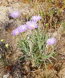 Xylorhiza tortifolia is a species of flowering plant in the family Asteraceae, known by the common names Mojave-aster and Mojave woodyaster.[4] The plant forms a small shrub with glandular leaves. The flower rays can be lavender, light blue, or white. Some varieties are known.