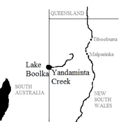 Yandaminta Creek is an ephemeral stream in Far West New South Wales[1] that flows from near Milparinka to the South Australian border where it enters Lake Boolka.[2] It location is at 30.03333 ° S 141.01667 ° E. Yandaminta Creek starts at an elevation of 216m and drops around 128m over its 159 km length entering the lake at an elevation of 88.4m .[3]