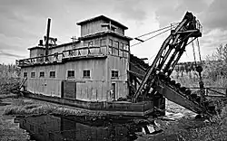 Numerous rustic cabins and historic sites are located in the preserve. One of the most significant sites is Slaven's Roadhouse, at Coal Creek, built by prospector Frank Slaven in 1932. Slaven lived there until 1938, after which Gold Placers, Inc. used the cabin as a bunkhouse and supply drop for their gold dredging operations on Coal Creek. The cabin continues to be used as a dog drop station during the Yukon Quest dogsled races each February. In the summer the cabin serves as a bunkhouse for visitors and Park Service personnel.[16] The roadhouse is a contributing feature in the Coal Creek Historic Mining District, which encompasses a number of structures associated with coal dredge mining on Coal Creek. The district's centerpiece is the Coal Creek dredge, floating in the creek. The dredge was built in Oakland, California in 1935 and shipped to the site, operating from 1936 until 1977,[17] having recovered $3,229,124.61 worth of gold.[18] Biederman's Cabin is located nearby, where mail carrier Ed Biederman boarded dogs for miners and trappers during the summer, using two fish wheels to catch enough salmon to feed the dogs.[17]
