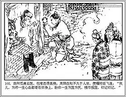 With the publishing of Yue Fei's 17th folklore biography, The Story of Yue Fei (1684), a new, fictional Zhou Tong emerged, who differed greatly from his historical persona. Not only was he now from Shaanxi, but he was Yue's adopted father, a learned scholar with knowledge of the eighteen weapons of war, and his personal name was spelled with a different, yet related, Chinese character.[5] The novel's author portrayed him as an elderly widower and military arts tutor who counted Lin Chong and Lu Junyi, two of the fictional 108 outlaws on which the Water Margin is based, among his former pupils.[6] A later republican era folktale by noted Yangzhou storyteller Wang Shaotang not only adds Wu Song to this list, but represents Zhou as a knight-errant with supreme swordsmanship. The tale also gives him the nickname "Iron Arm", which he shares with the executioner-turned-outlaw Cai Fu, and makes the outlaw Lu Zhishen his sworn brother.[3][5] Because of his association with the outlaws, he is often confused with the similarly named outlaw Zhou Tong.[7]