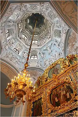 In plan, the church is a centric structure: an equilateral cross with rounded ends; the endings are divided into three parts. The type of centric temple of this shape was widespread in Catholic countries and expressed the main features of the European Baroque of the XVII century.[40] According to the type of architectural composition, the church is an "octagon on the quadrangle". This composition was mainly used in the design of Russian Orthodox churches. Above the central part of the church rises an octagonal tower, completely covered with intricate relief ornaments. Cornices divide the entire structure of the tower into three light tiers. Lower tier is formed by rectangular windows with rounded top. The middle tier has the same windows, and the upper tier has small octagonal windows. The church is topped by a dome with four-petal windows and a carved gilded crown. The wedding of a church with a crown is completely not in the Russian tradition.[41]