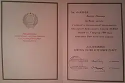 В 1989 году удостоен почетного звания Заслуженный деятель науки и техники РСФСР.