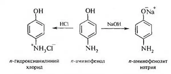 Аминофенолы являются амфотерными веществами, они проявляют кислотные свойство за счет гидроксогруппы и основные свойства за счет аминогруппы:[2][3]