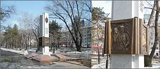 На левой стороне обелиска расположен барельеф с изображением казака, охраняющего границу.