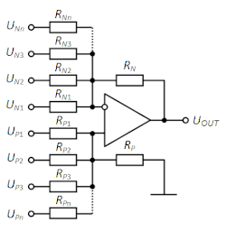 Таким образом, схема осуществляет сложение напряжений и вычитание напряжений с весовыми коэффициентами, равными: