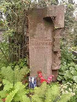 Похоронен на Новодевичьем кладбище в Москве. Согласно воспоминаниям Анастаса Микояна, не хотел быть похороненным в Кремлёвской стене[15]. Могила на первом участке. Напротив могилы Андреева находится могила его жены Доры Хазан-Андреевой.