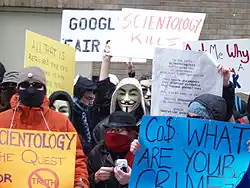 - ↑ John S. Forrester (11 февраля 2008), Dozens of masked protesters blast Scientology church. Web-based foes guard IDs, assert risk of retribution, The Boston Globe, Архивировано 3 марта 2016, Дата обращения: 17 марта 2012 Источник. Дата обращения: 17 марта 2012. Архивировано 3 марта 2016 года.