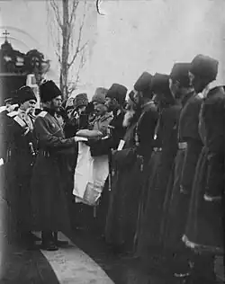 По окончании богослужения Император почтил своим присутствием Терский войсковой круг, который состоялся у собора. Войсковые старшины поднесли Царю хлеб-соль, и под звуки гимна и марша Терского войска Император обошел войсковой круг. Затем Николай II принял хлеб-соль также от русского крестьянского населения области и от местных горских народов. Депутация от осетин поднесла Государю 10 000 рублей на нужды раненых, а от караногайцев — 5000 рублей[7].