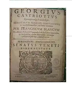 - Georgius Castriotus Epirensis, vulgo Scanderbegh. Per Franciscum Blancum, De Alumnis Collegij de Propaganda Fide Episcopum Sappatensem etc. Venetiis, Typis Marci Ginammi, MDCXXXVI (1636).