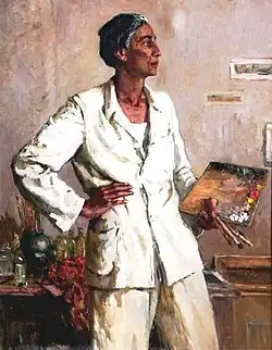 Напряженный взгляд, неустойчиво-подвижная поза, нервный силуэт — всё в портретируемом говорит о натуре нервной, темпераментной, в известной степени неуравновешенной. Сам портретируемый, как незаурядная личность, возбуждает сильную реакцию со стороны художника. В яркой человеческой натуре он увлекается не столько ее внешней «колоритностью», экзотичностью (хотя и это импонирует ему), сколько внутренней одержимостью, постоянным напряжением воли. Образ получается несколько возвышенно-романтизированным, а не спокойно-созерцательным. Здесь, пожалуй, мы встречаемся не с исследованием характера, а с волевым преувеличением близких и дорогих автору особенностей портретируемого. Живописный строй, манера наложения мазка, резкие сочетания цвета, «бурный» рисунок не противоречат существу портретируемого, но они говорят не только о нем, но и (может быть, даже в большей степени) о тех эмоциях, которые свойственны художнику[32].