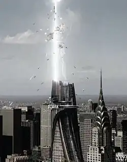 - Восстановленный дизайн Башни Старка, теперь известной как Башня Мстителей, впервые появляется в фильме Первый мститель: Другая война. Эта Башня очень похожа на ту, что была видна в фильме «Мстители», но имеет несколько изменений, в том числе ангар самолета, а знак STARK заменяется логотипом Avengers «A».[16]