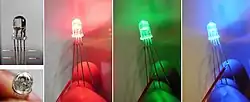 - Многокристальные светодиоды, чаще — трёхкомпонентные (RGB-светодиоды), имеющие в своём составе три полупроводниковых излучателя красного, зелёного и синего свечения, объединённые в одном корпусе.
