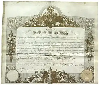 9 марта 1851 г. Высочайшим Указом ему и его брату пожалован «Дворянский герб во всех честных и пристойных случаях, в письмах, печатях, на домах и домовых вещах и везде, где честь их и другие обстоятельства того потребуют», и жалованная грамота о наследственном дворянстве.