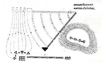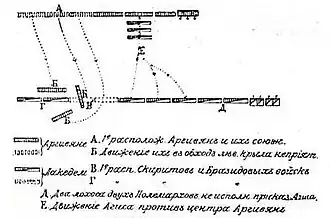 На правом крыле спартанского войска стояли аркадские союзники (тегейцы, меналийцы и герейцы). По центру во главе с царем были выстроены их отборные войска. На левом фланге были гоплиты-илоты, ветераны халкидской кампании, ранее сражавшиеся против афинян под началом Брасида, и отборный лох скиритов. Спартанская конница стояла на обоих флангах.