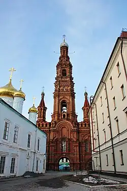 Нижний мощный двухэтажный четверик расположился вдоль улицы в виде прямоугольных, также двухэтажных объёмов-крыльев, завершаемых сквозными гранёными башенками над шатровыми покрытиями и с лепестковыми главками. Над восточным и западным ризалитами четверика располагались башенки с пятью крестами (частично утрачены)[11].