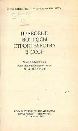 - Правовые вопросы строительства в СССР / Под ред. И. Л. Брауде. — М., 1960.