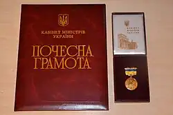 - 1 2 Файл:Почётная грамота Кабинета Министров Украины (в развернутом виде) Булгакову М.А.jpg