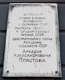 - ↑ Памятник Аркадию Пластову в Ульяновске. yavarda.ru. Дата обращения: 28 июля 2024. Архивировано 28 июля 2024 года.