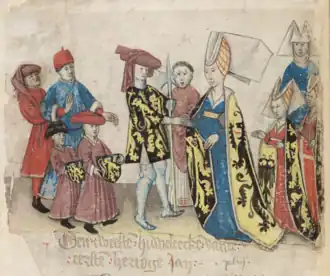 Обручение герцога Жана I с Маргаритой Французской (1267). Миниатюра рукописи «Брабантcких деяний» Яна ван Бундале