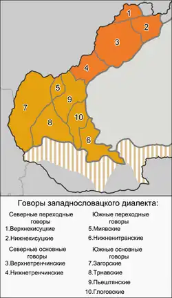 К XII—XIII векам в западнословацком диалекте отмечаются процессы диалектной дифференциации, выделившие значительные по территориальному охвату регионы западнословацких говоров, противопоставив при этом северный диалектный регион вместе с верхнетренчинским ареалом южному региону. В числе данных процессов — дифтонгизация долгих гласных é > i̯e, ó > u̯o, произошедшая в западнословацком диалекте (не всегда последовательно и не во всём ареале). В северных говорах дифтонги сохранились (с возможным образованием согласных звуков на месте неслоговых элементов сочетаний гласных) — bi̯élí / bjelí (литер. biely «белый»), ku̯óň / kvoň (литер. kôň «конь»), в юго-восточных и юго-западных — монофтонгизировались как и в чешском языке — bílí, kóň[52][53][54]. Другим процессом, происходившим в этот же период был процесс ассибиляции согласных ť и ď: ť > c, ď > ʒ. Он охватил северную и юго-западную части западнословацкого ареала. При этом позиции, в которых осуществлялась ассибиляция, были различными для северных и юго-западных говоров западнословацкого диалекта. В южных западнословацких говорах ассибиляция осуществилась в позиции перед гласным e из *ě и частично из *ę — ʒeci (литер. deti «дети»), deň (литер. deň «день»), в то время как в северных западнословацких — перед гласным e любого происхождения, кроме e < *ь (ʒeci, ʒeň), сходный процесс был характерен и для говоров восточнословацкого диалекта[55][56][57].