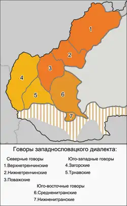 - Сходное развитие с верхнетренчинской системой гласных в западнословацком диалектном ареале имеют гласные в нижнетренчинских говорах, в них также, хотя и ограниченно, представлены дифтонги: i̯e (имеющий в ряде случаев долгий слоговой компонент — i̯é) и частично u̯o[87]. В поважских говорах в разных частях их ареала встречаются дифтонги i̯e (нередко выступающий в форме i̯é с долгим слоговым гласным) и i̯a. На месте u̯o в части поважских говоров представлено сочетание vó[88].
