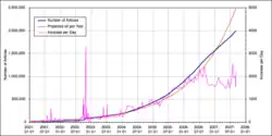 График числа статей в английской Википедии с 10 января 2001 года по 9 сентября 2007 года (день двухмиллионной статьи)