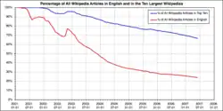 Доля всех статей Википедии на английском и 10 крупнейших языковых разделов; на июль 2008 года менее 23 % статей Википедии — на английском