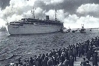 ![]() «Вильгельм Густлофф», переоборудованный в плавающий госпиталь и перекрашенный в соответствии с требованиями международного права по идентификации госпитальных судов. Данциг, 23 сентября 1939 года |