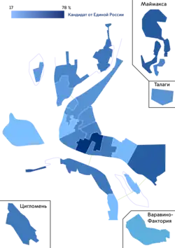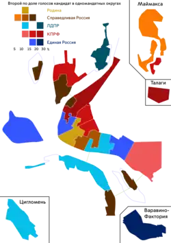 В 12 из 15 одномандатных округов победил кандидат от Единой России. В 5 и 10 округах победили кандидаты-самовыдвиженцы, а в 3 — кандидат от Родины.