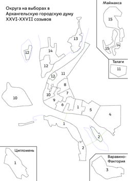 - ↑ Выборы депутатов Архангельской городской Думы двадцать седьмого созыва (схема избирательных округов) (недоступная ссылка — история).