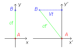 В системе же отсчёта импульс света излучается из начала координат в момент его совпадения с началом координат системы (точкой A), а попадает в приёмник B через время , которое измеряется часами, движущимися вместе с системой . Координата точки B — смещение, обозначенное на правой диаграмме на рисунке пунктиром, равно , точка A указывает место, откуда был излучён импульс, траектория импульса в изображена зеленой линией.