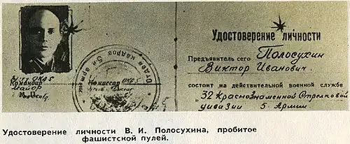 2. Колотило А. Легендарный комдив. Указом Президента Российской Федерации полковнику Виктору Полосухину, командовавшему 32-й стрелковой дивизией в битве за Москву, присвоено звание Героя Российской Федерации. // Красная звезда. — 2021, 17 ноября. — С.10. Дата обращения: 28 ноября 2021. Архивировано 28 ноября 2021 года.